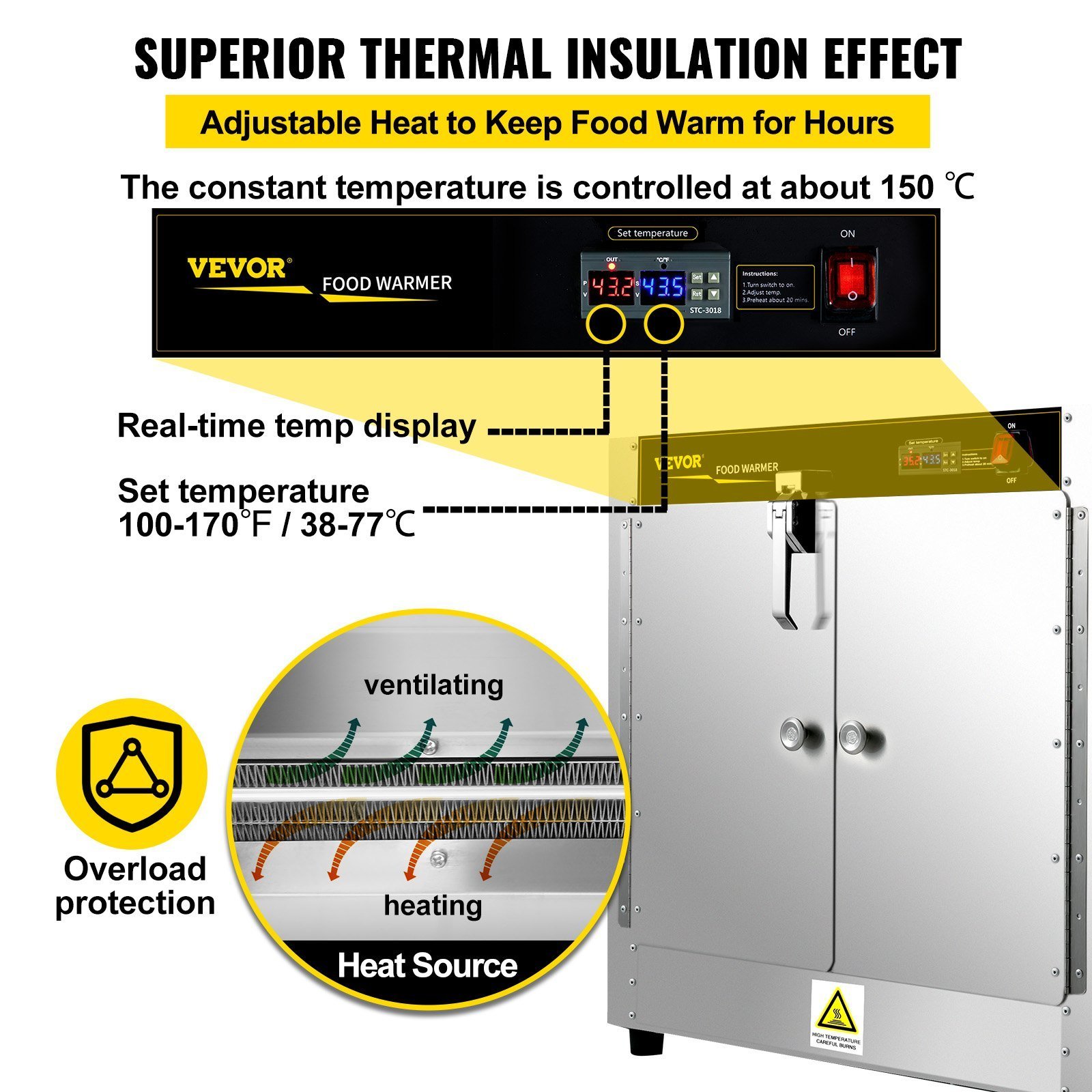 Temperature control for adjusting heating temperature from 100 to 170°F; thermostatic mode keeps the food at 150°F constantly and the internal PTC heat source can avoid over-heating, perfect for commercial catering use.